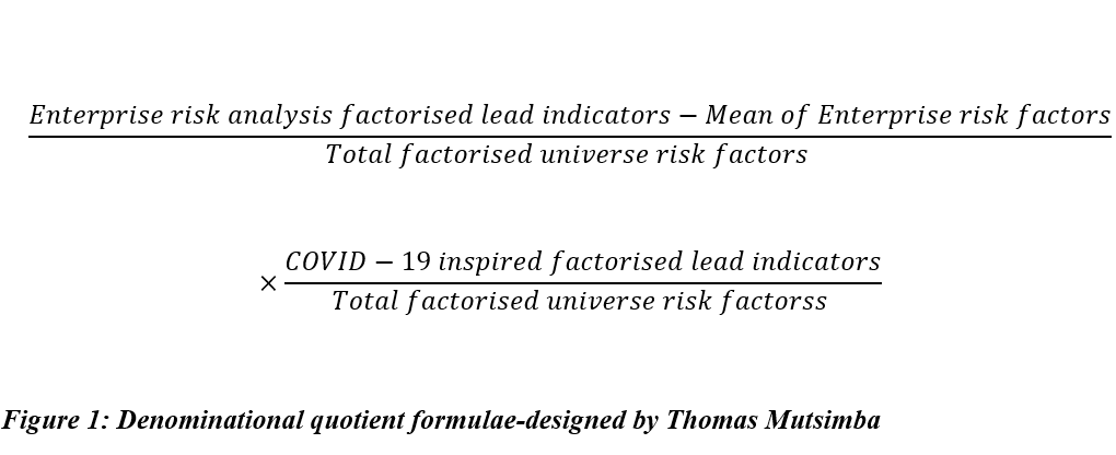 First we need to define generating denominational quotient. This refers to the perspiration dynamics of the envisaged and selected risk analyses motion sensory technique in an entity’s data science. The denominational quotient is a datum calculative portion centered deviation of movement from an existing risk infrastructural analysis to the desired strategic objectives which are denoted by the mean co-efficient posturing the bi-variance of risk factors measured at the existing and or forecasted enterprise risk analyses against the COVID-19 inspired risk analysis. The quotient formulae are as follows: